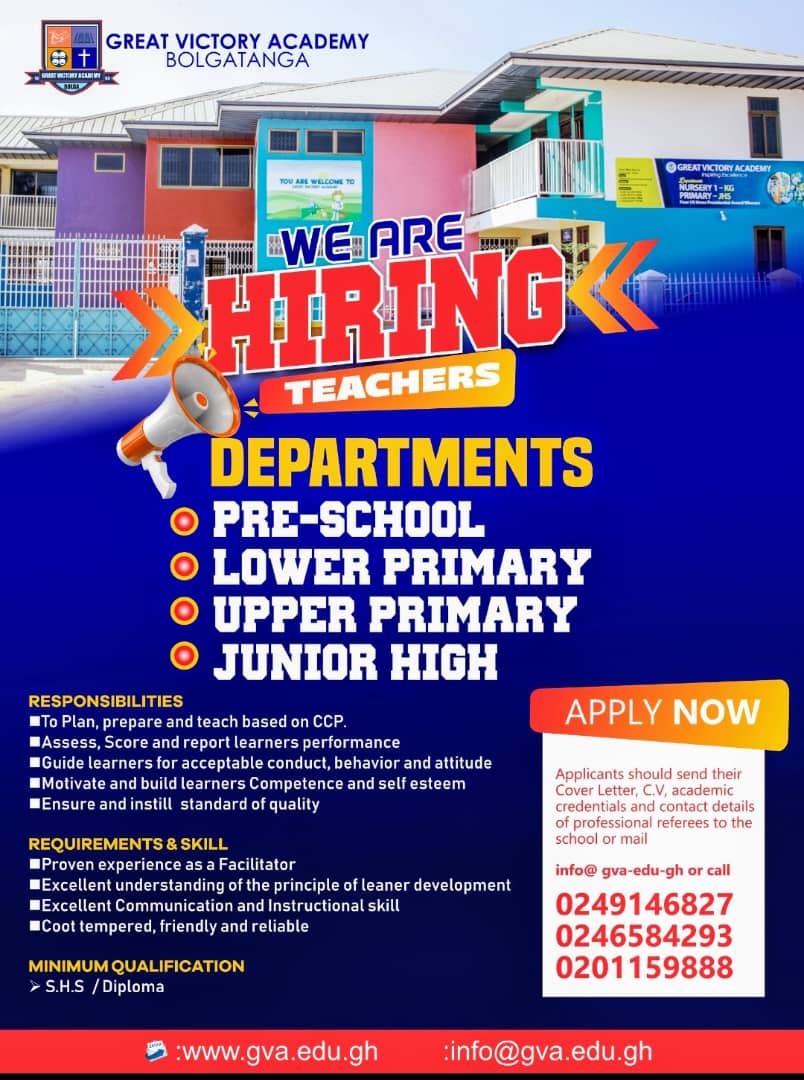 Great Victory Academy is currently recruiting dedicated, qualified, and motivated teachers to join our growing team for the upcoming academic year. We are looking for educators who are committed to excellence, love working with children, and are ready to make a lasting impact.